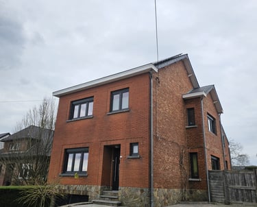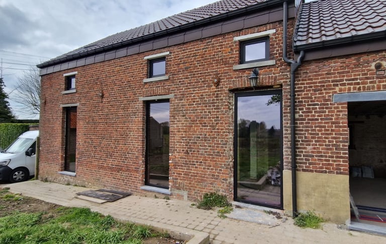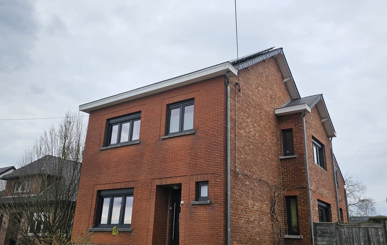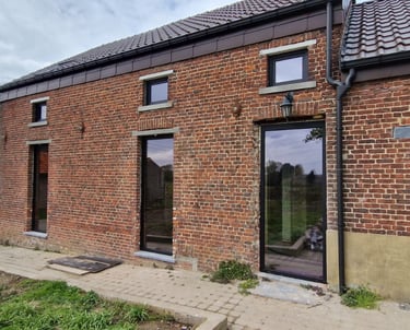 Rénovation complète d'une habitation avec pose de châssis PVC Salamander 82 mm en teinte gris anthracite. Remplacement des ouvrants d'origine par des profils contemporains, vitrage haute performance et finition soignée sur l'ensemble de la façade.